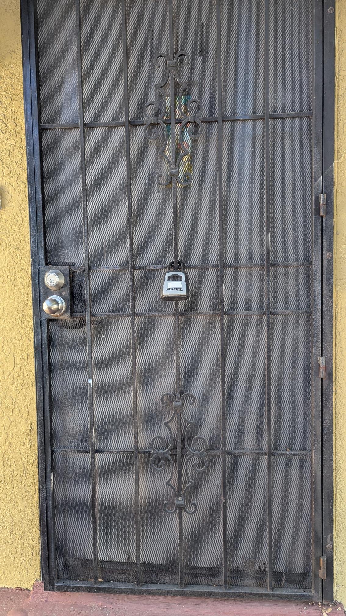 The lock box is located on the front screen black door, The lockbox contains a backup key for emergencies.